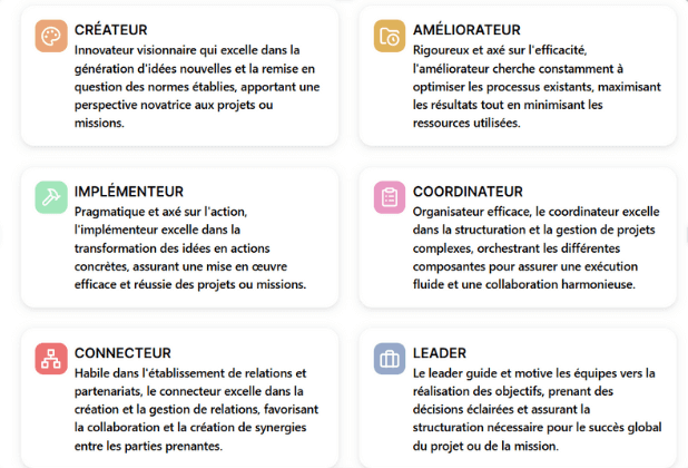 - une modélisation de profils types liés à l’innovation : créateur, implémenteur, améliorateur, connecteur, coordinateur, leader.