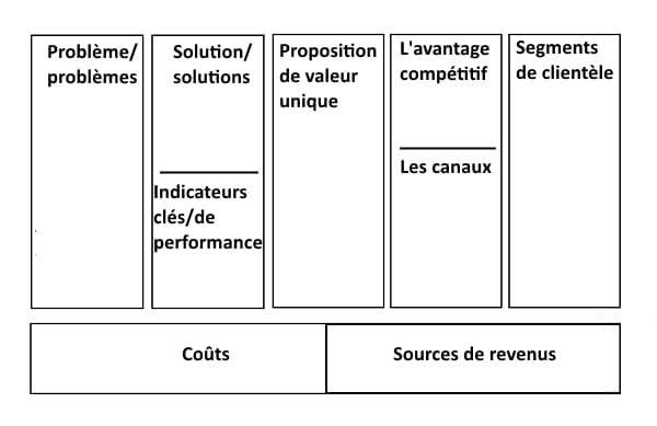- L’ensemble est constitué de 9 cases (problème/problèmes, proposition de valeur unique, solution/solutions, segments de clientèle, canaux, avantage compétitif, indicateurs de performance, coûts et sources de revenus) et s’inspire du Business model canvas.