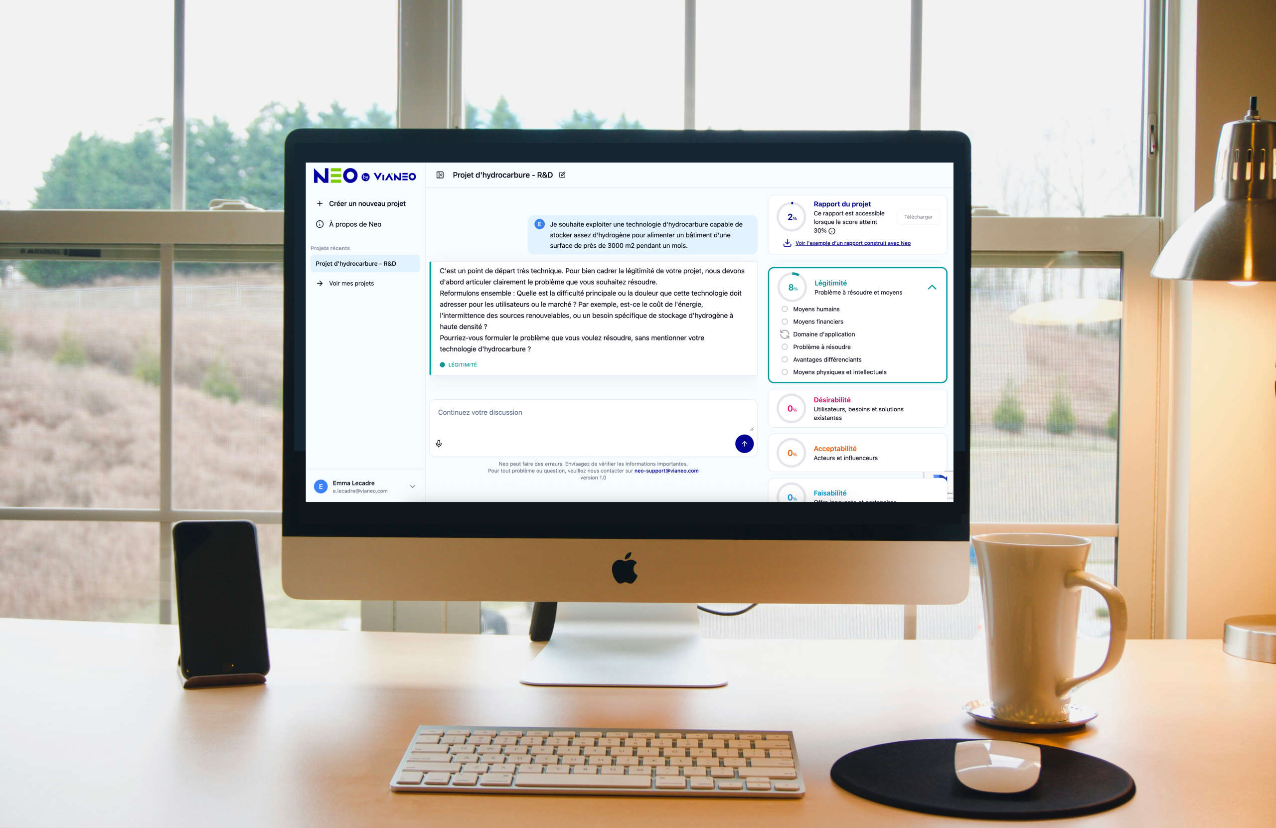 Plutôt que de fournir des réponses toutes faites, NEO pose des questions structurantes qui obligent le porteur à expliciter ses hypothèses, ses choix et ses incertitudes. Cette approche pédagogique favorise l’apprentissage actif et fait évoluer progressivement la posture du porteur : de chercheur ou ingénieur centré sur la technologie vers porteur de projet capable d’argumenter et de décider.